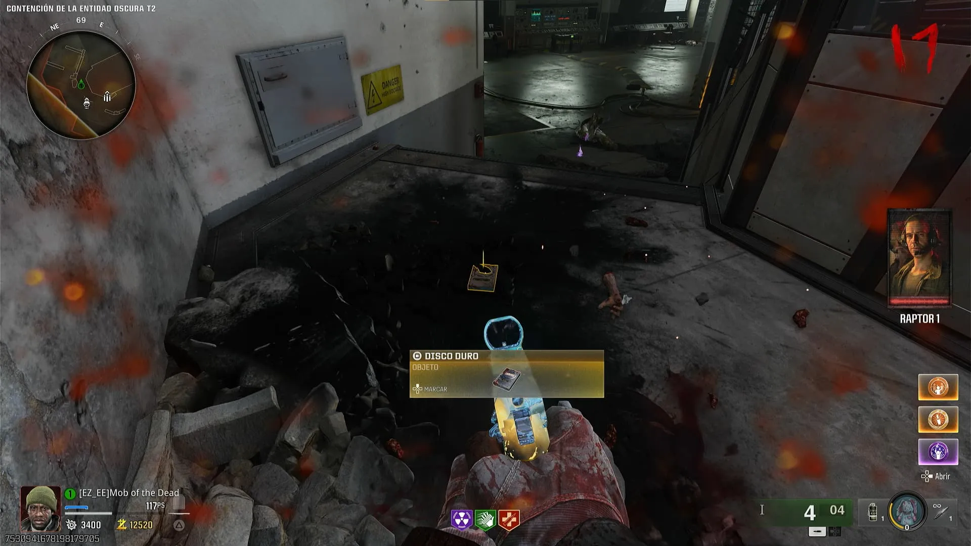 - Interactúa con el contenedor para colocar el disco duro, luego debes esperar unos segundos hasta que este termine. Los zombies trataran de atacar el contenedor así que debes protegerlo o simplemente dejar un zombie y ponerte frente a el (por alguna razón te ignora completamente)