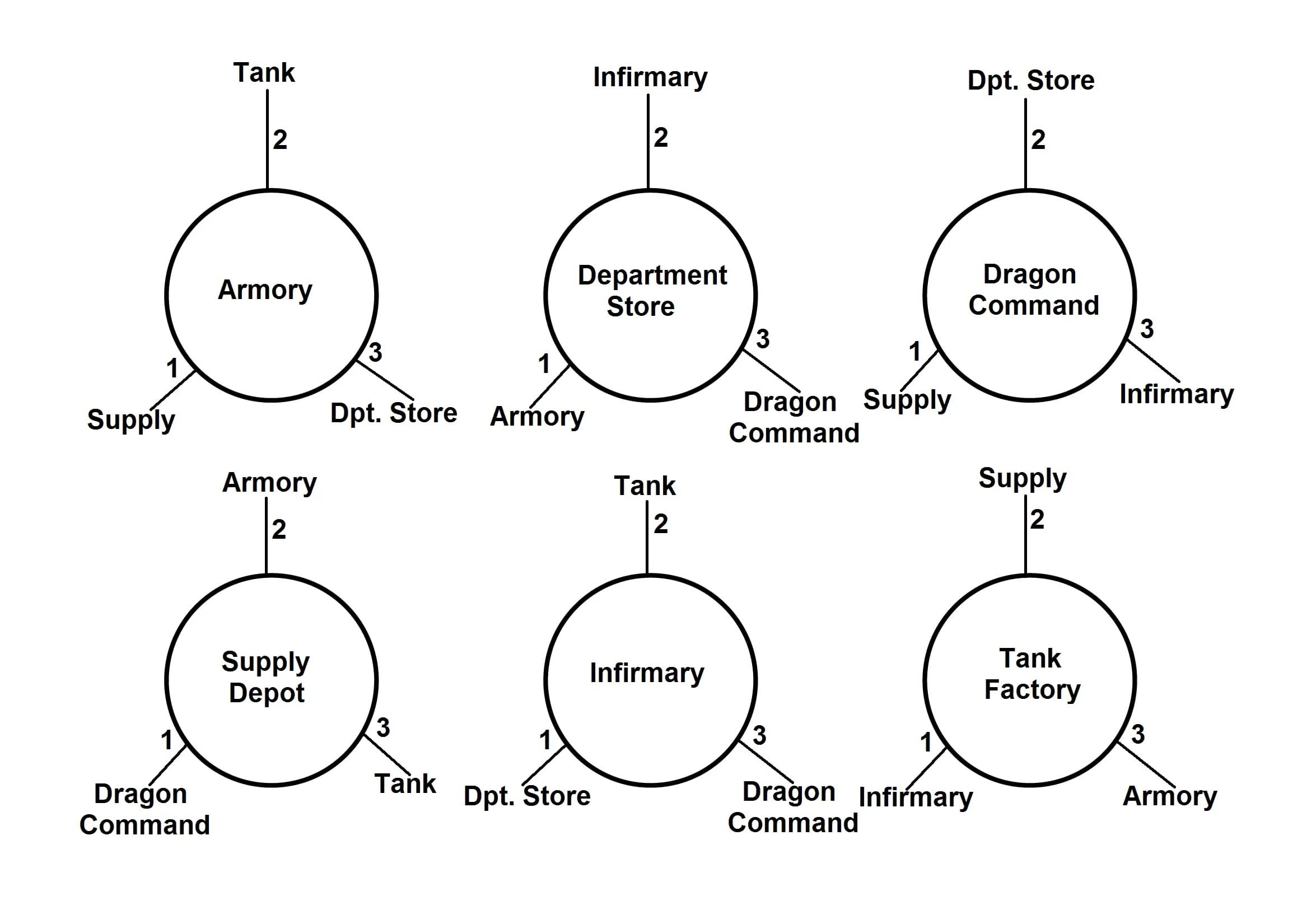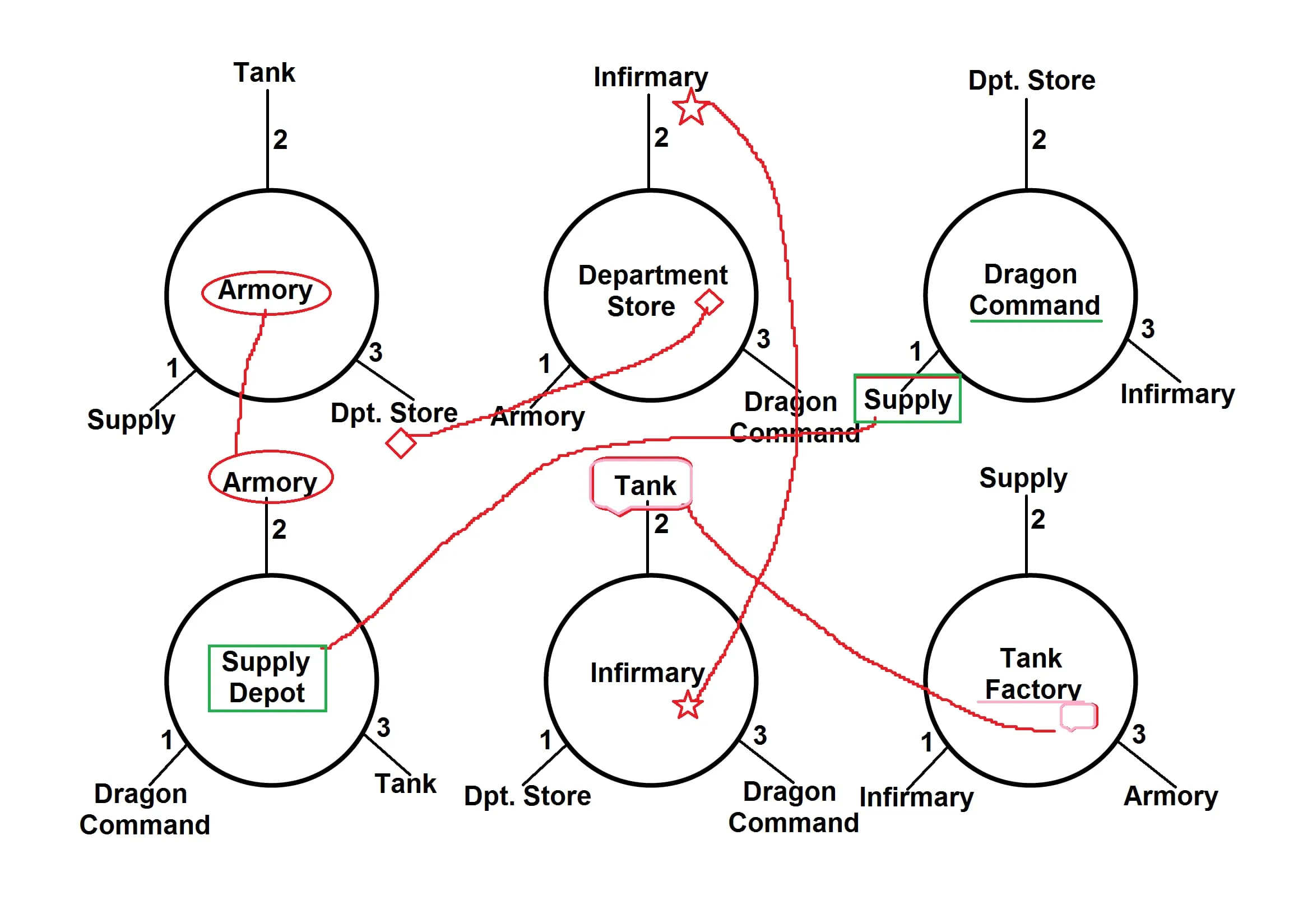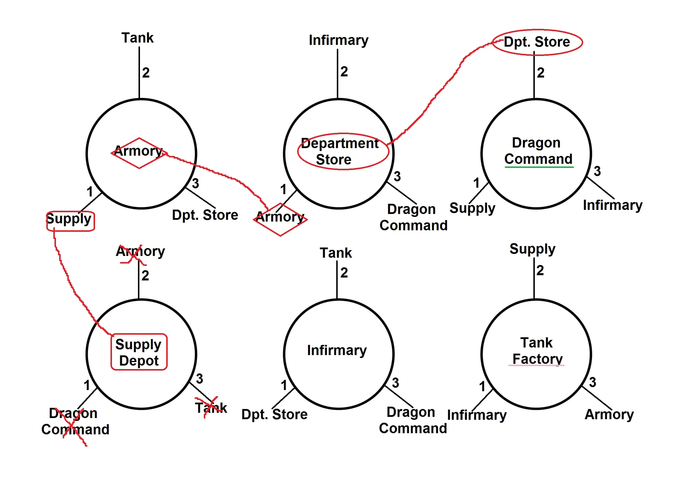 d. Este es el incorrecto porque al llegar a Supply Depot no puedo conectar a ninguna otra válvula, porque Armory ya tiene una conexión de aire, Dragon Command es el punto de partida y Tank Factory es el punto final y todavía me falta Infirmary así que no la puedo conectar a esa.