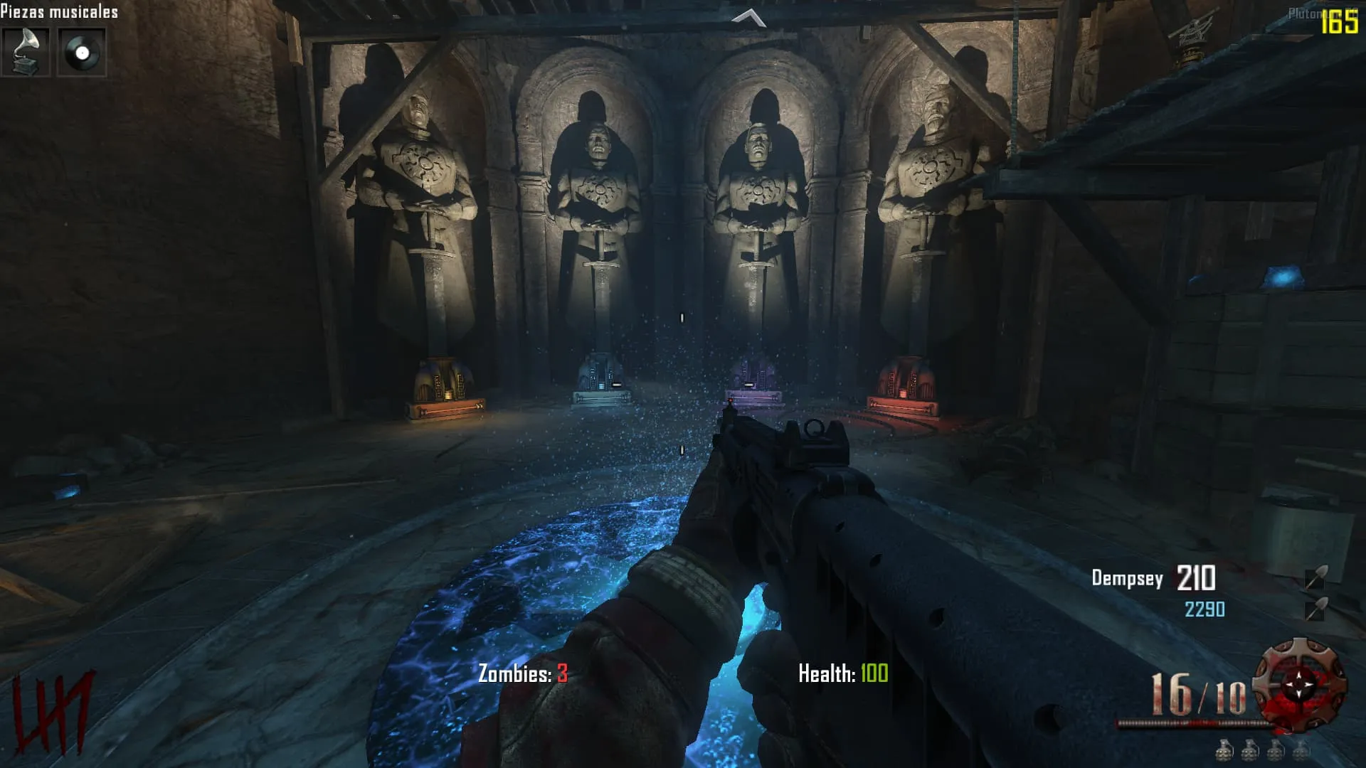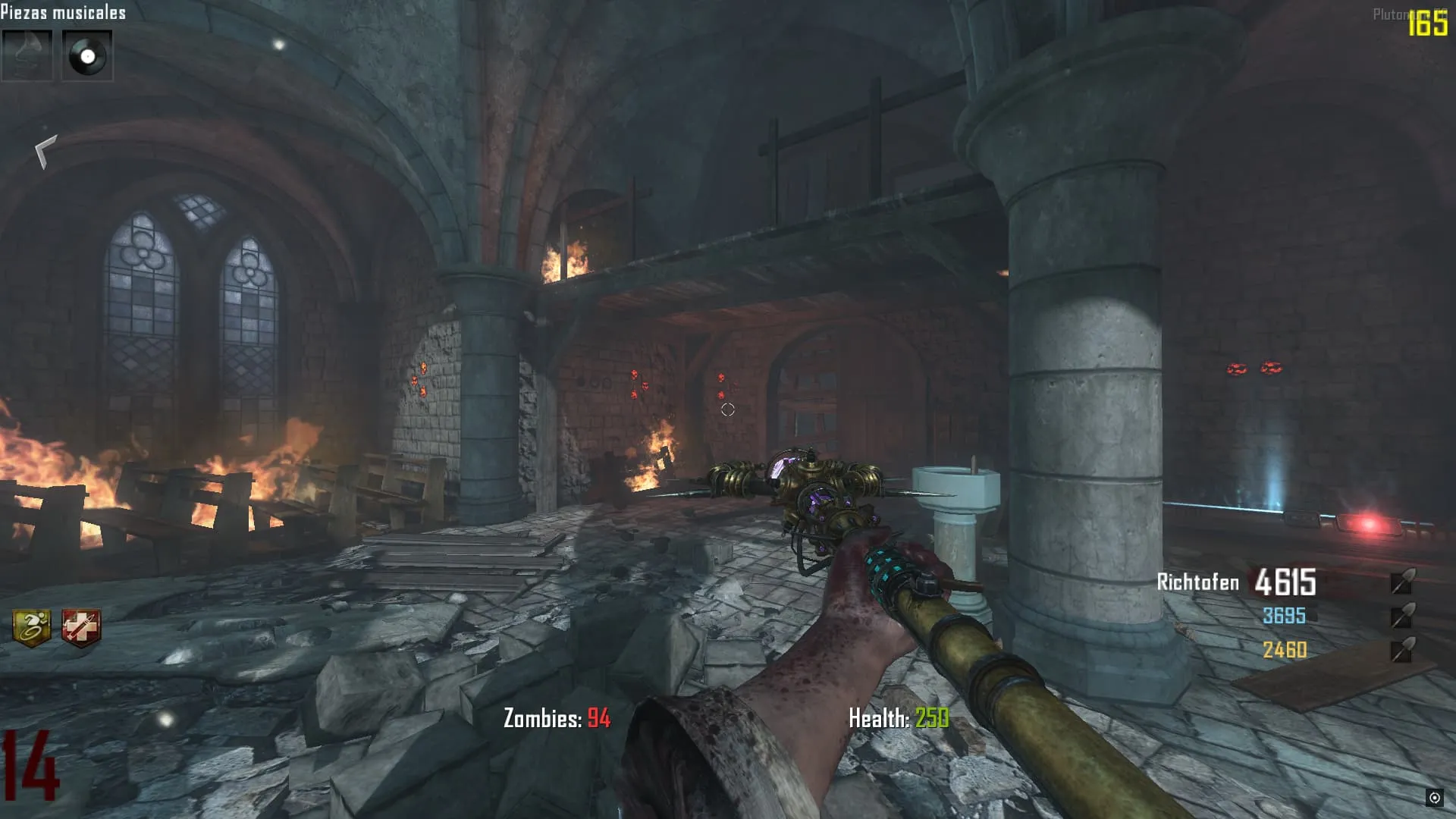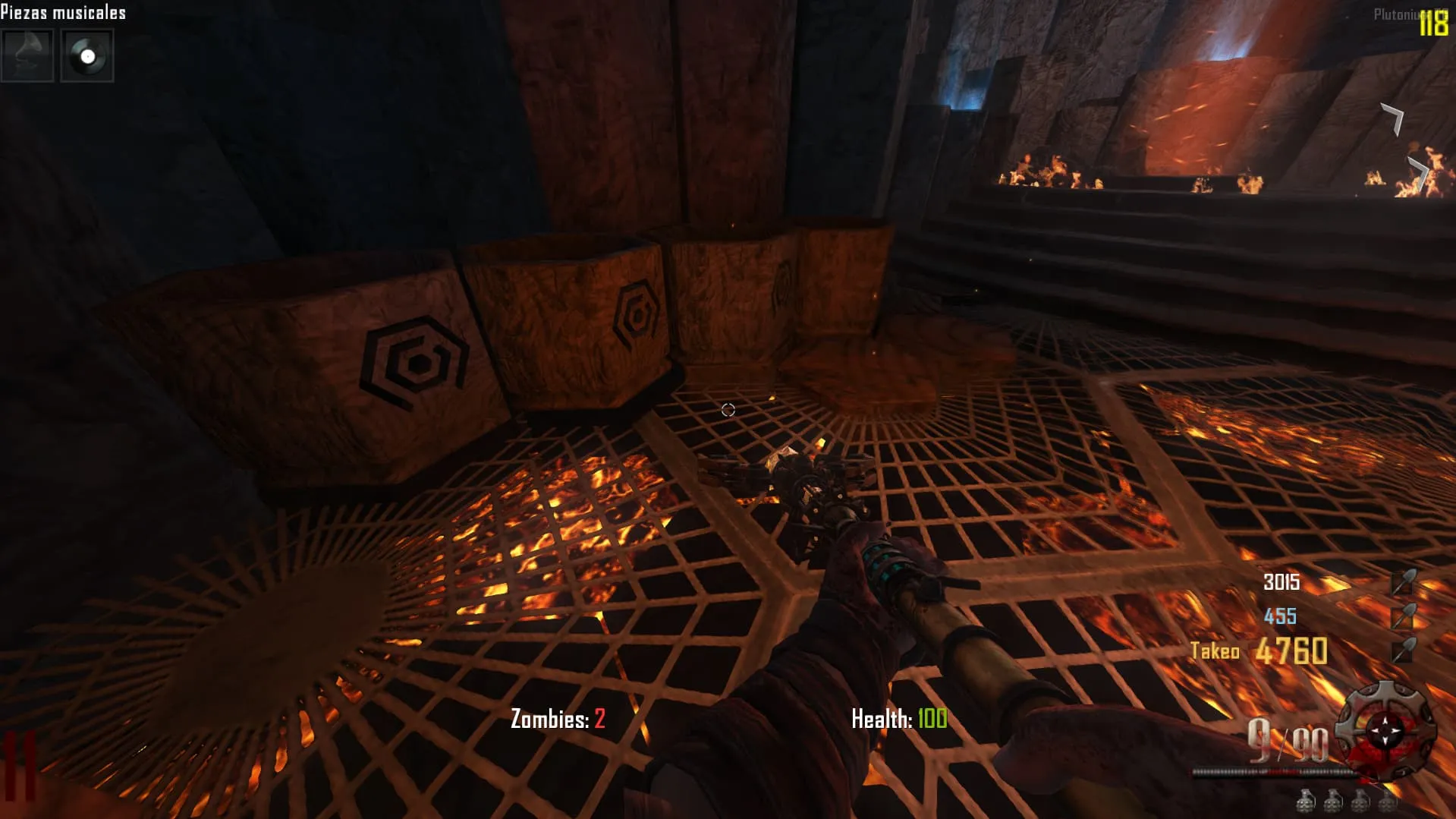 - Ve al «Crazy Place», coloca el baston de fuego en un pedestal y mata 20 Zombies en esa zona. Luego tendrás el baston mejorado y lo podrás agarrar.