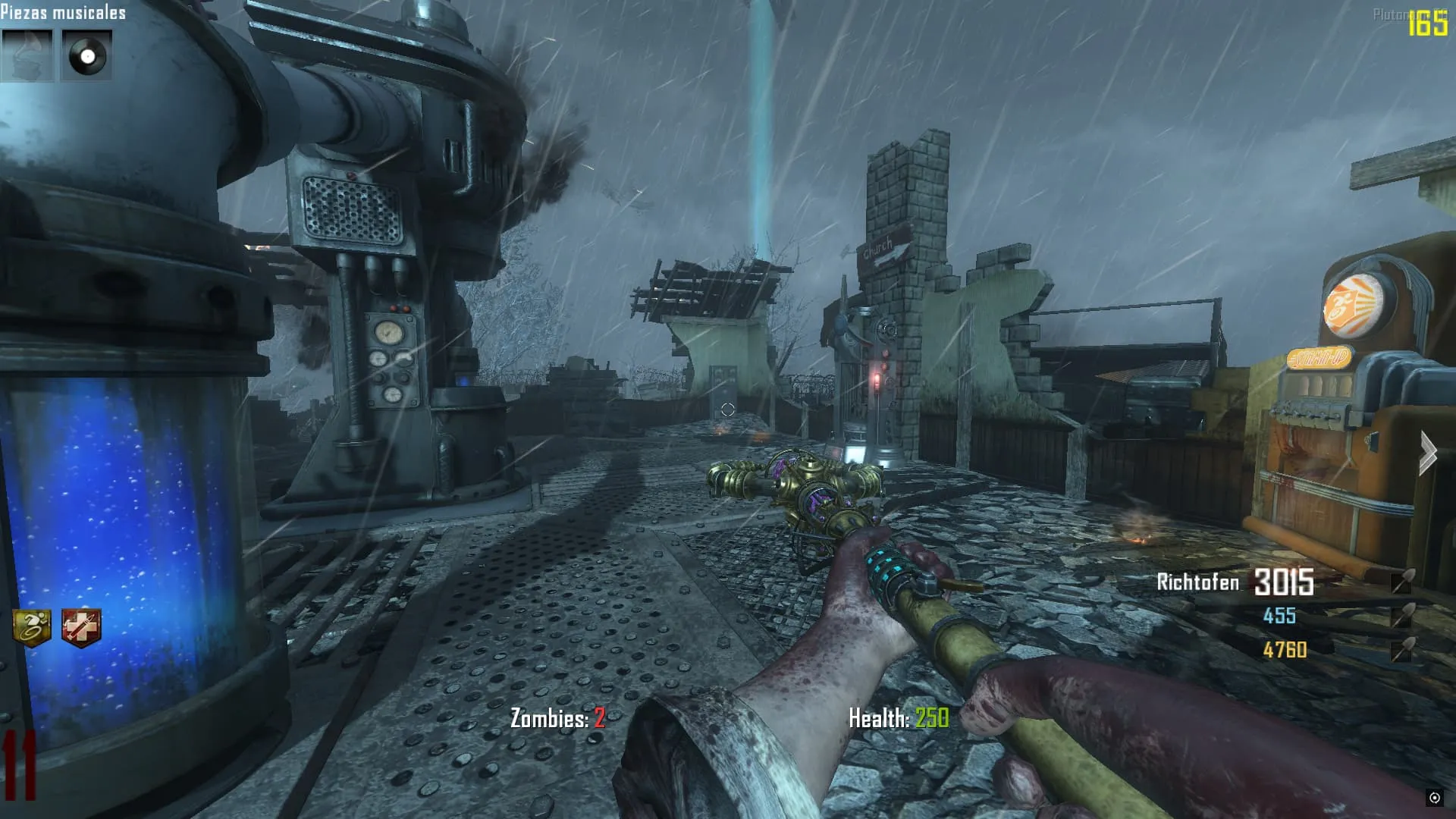 - Para conseguir las tres piezas del baston eléctrico, debes montarte en el tanque dentro de la iglesia y saltar desde el a diferentes lugares escondidos donde estarán las piezas del baston.