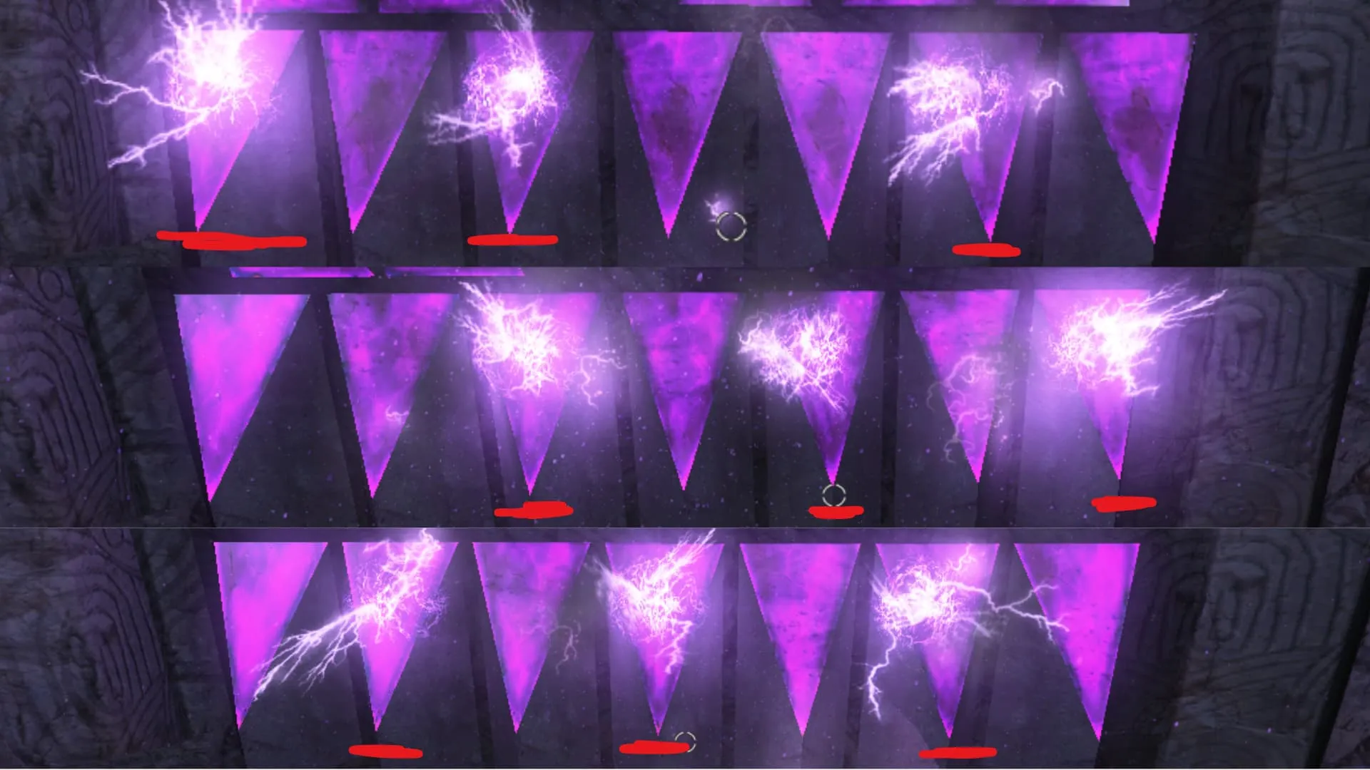 - Ve a la zona de excavación y cambia las palancas alrededor de la excavación para cambiar las luces de los anillos al centro, asegúrate que todos estén de color morado. Luego dispárale al orbe morado debajo de los anillos con el baston eléctrico.