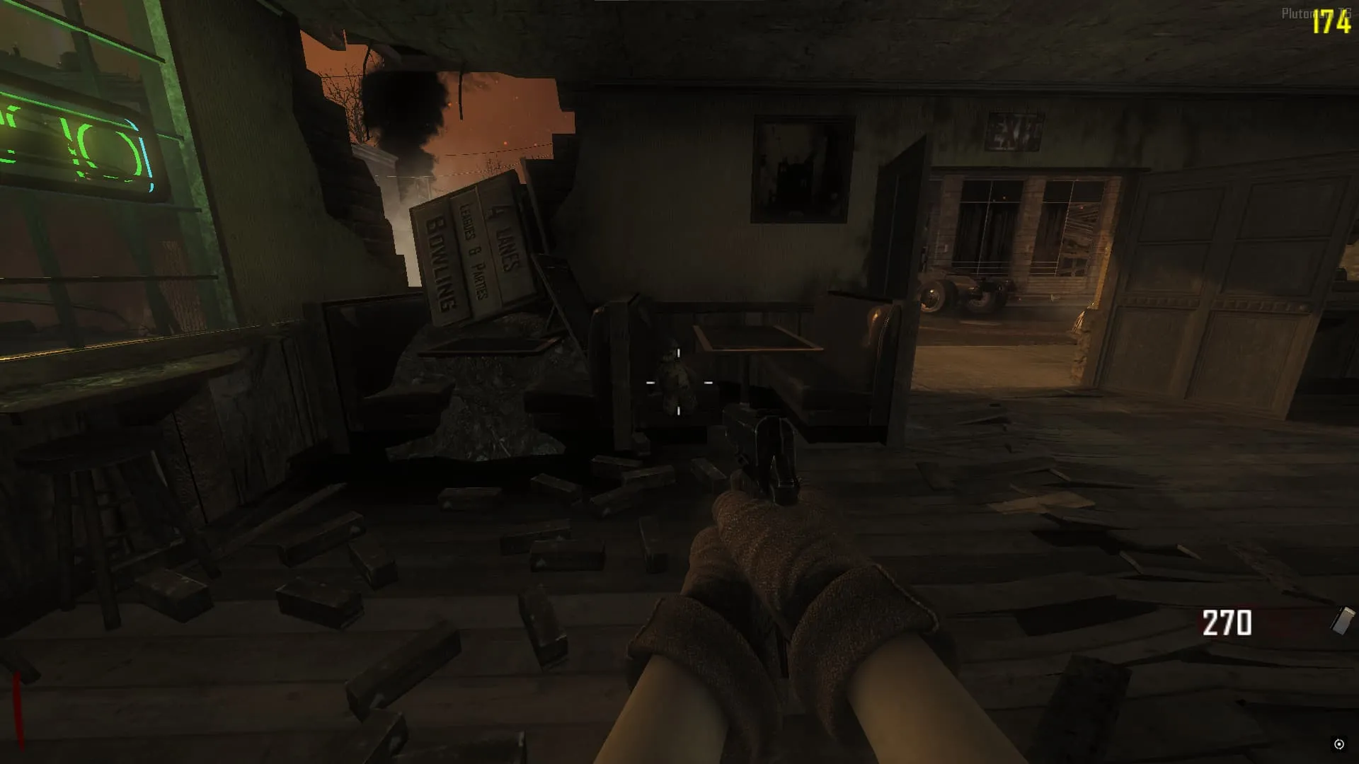 1. Dentro del bar, encima de una silla cerca de la entrada.