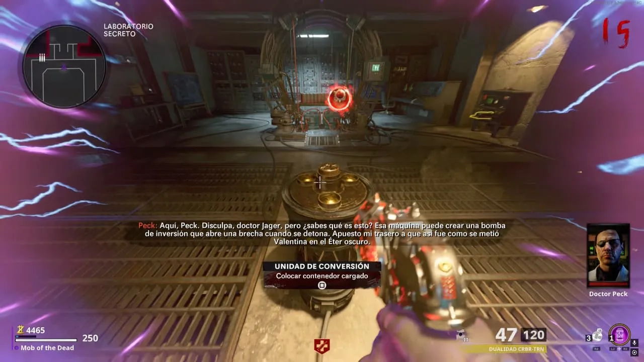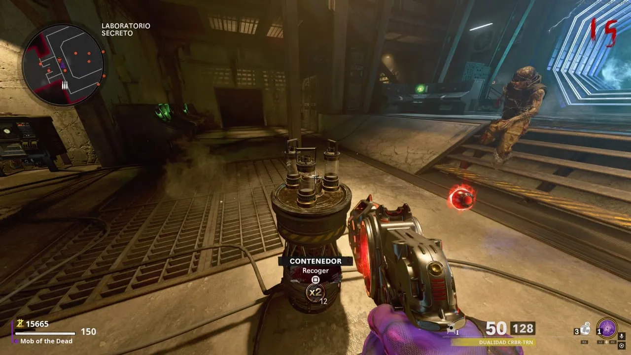 1. Al entrar a la Zona Secreta y haber activado una ronda especial, se desbloquearán unos contenedores en el centro del laboratorio, interactúa con cada uno para llevártelos todos.