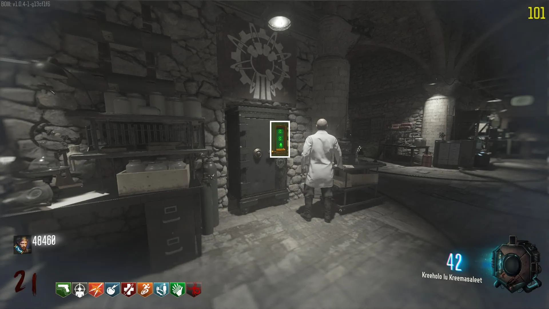 Por último, en cierto punto, el científico pondrá un código en la caja fuerte frente a él. Memorízate esos símbolos (cada partida es diferente). Cuando el científico ponga los símbolos en la caja fuerte, te teletransportarás al poco tiempo.