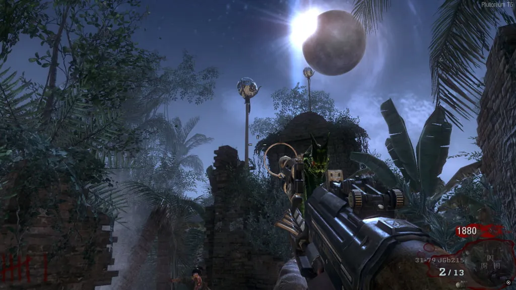Al haber acuchillado todas, ve a la zona donde está el carro minero, arriba de Juggernog/Speed-Cola y veras una serie de palos a los cuales tienes que tirarle una granada. Al explotar desaparecerán los palos y se acabara el eclipse.
