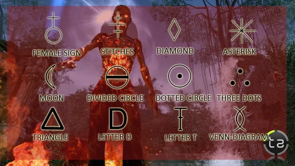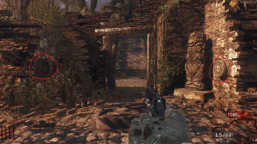 Activa el Eclipse. Aparecerán 12 piedras que al acuchillarlos saldrán unos símbolos en ellas. Tienes que acuchillarlas todas. Hay 5 en la Sala Inicial, 2 en el templo de lodo, 3 entre la cascada y el poder.