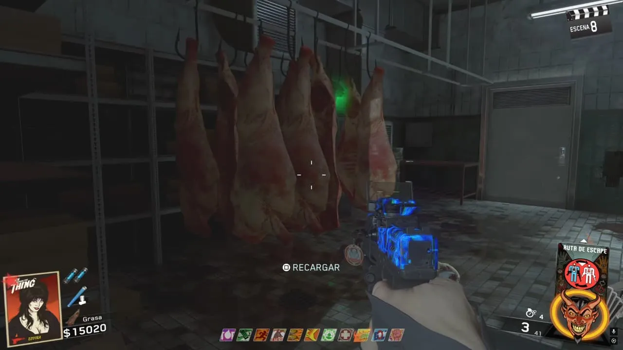 Consigue el cuchillo de carnicero y acuchilla al cerdo de la izquierda dentro del freezer del Supermercado.