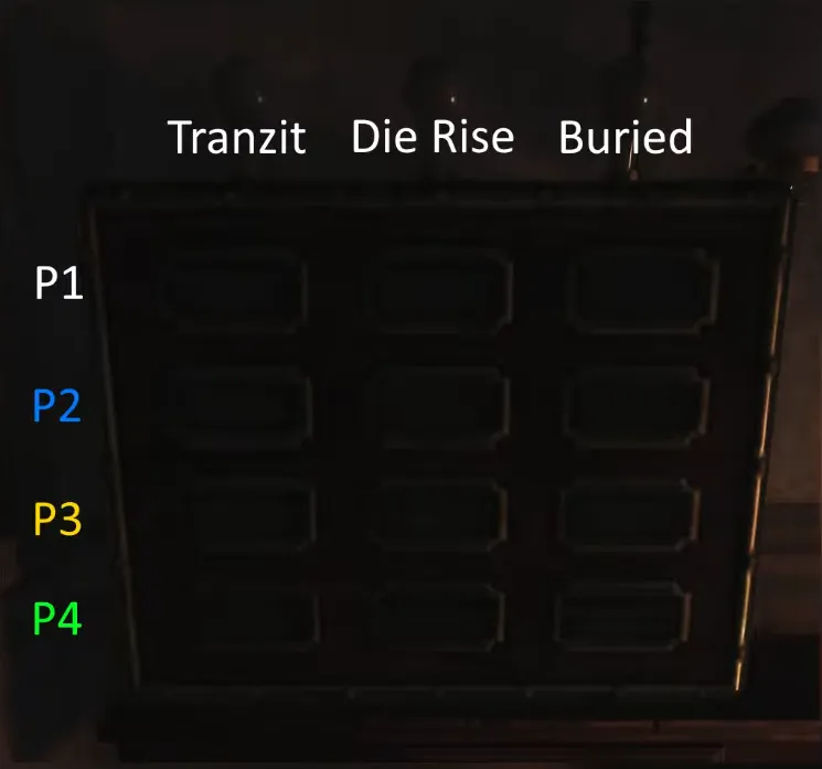 La manera en que funciona esta caja es la siguiente: Cada columna representa un mapa mientras que las filas representan un jugador. Los cuadros se iluminarán del color del bando que los jugadores hayan escogido y si todas las luces se encuentran iluminadas de un mismo color (completando su Quest Principal e insertando la Nav Card correcta en cada mapa), podrás activar el Super Easter Egg