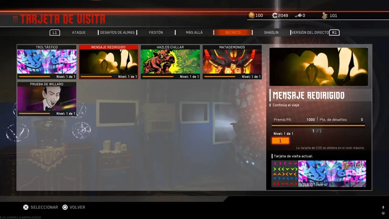 Al hacerlo, desbloquearas la tarjeta de visita «Mensaje Redirigido» dentro de Desafío de Almas > Secreto.